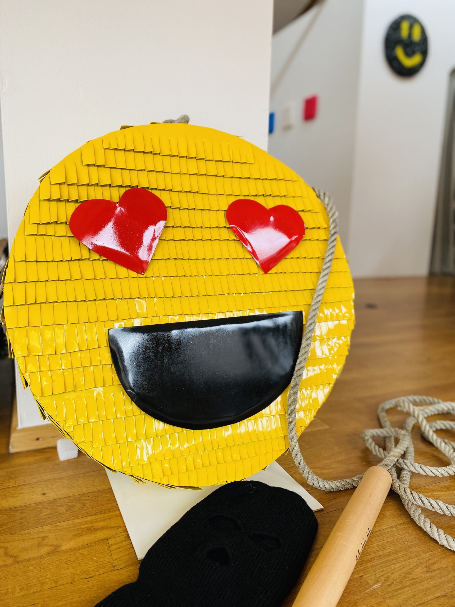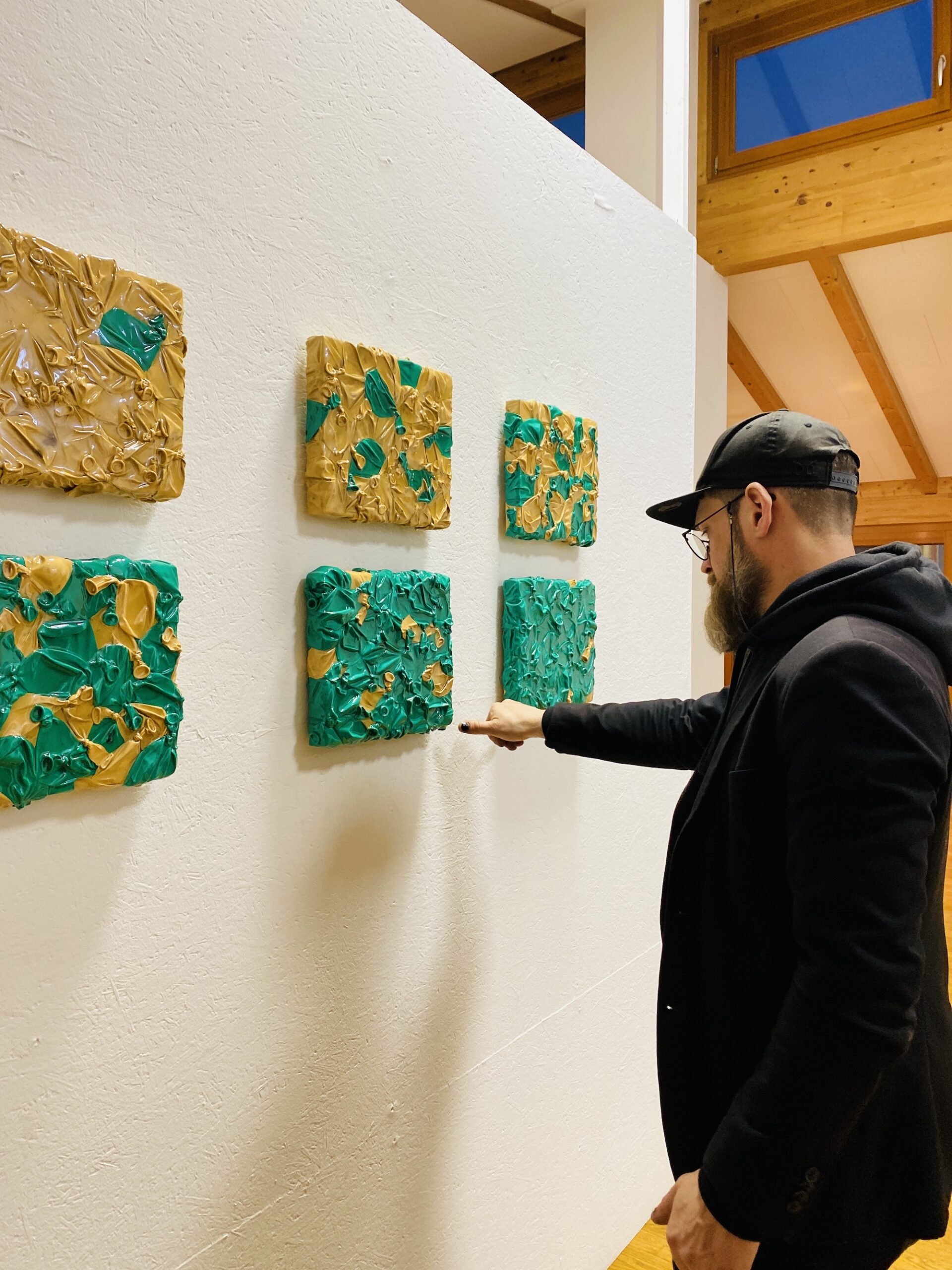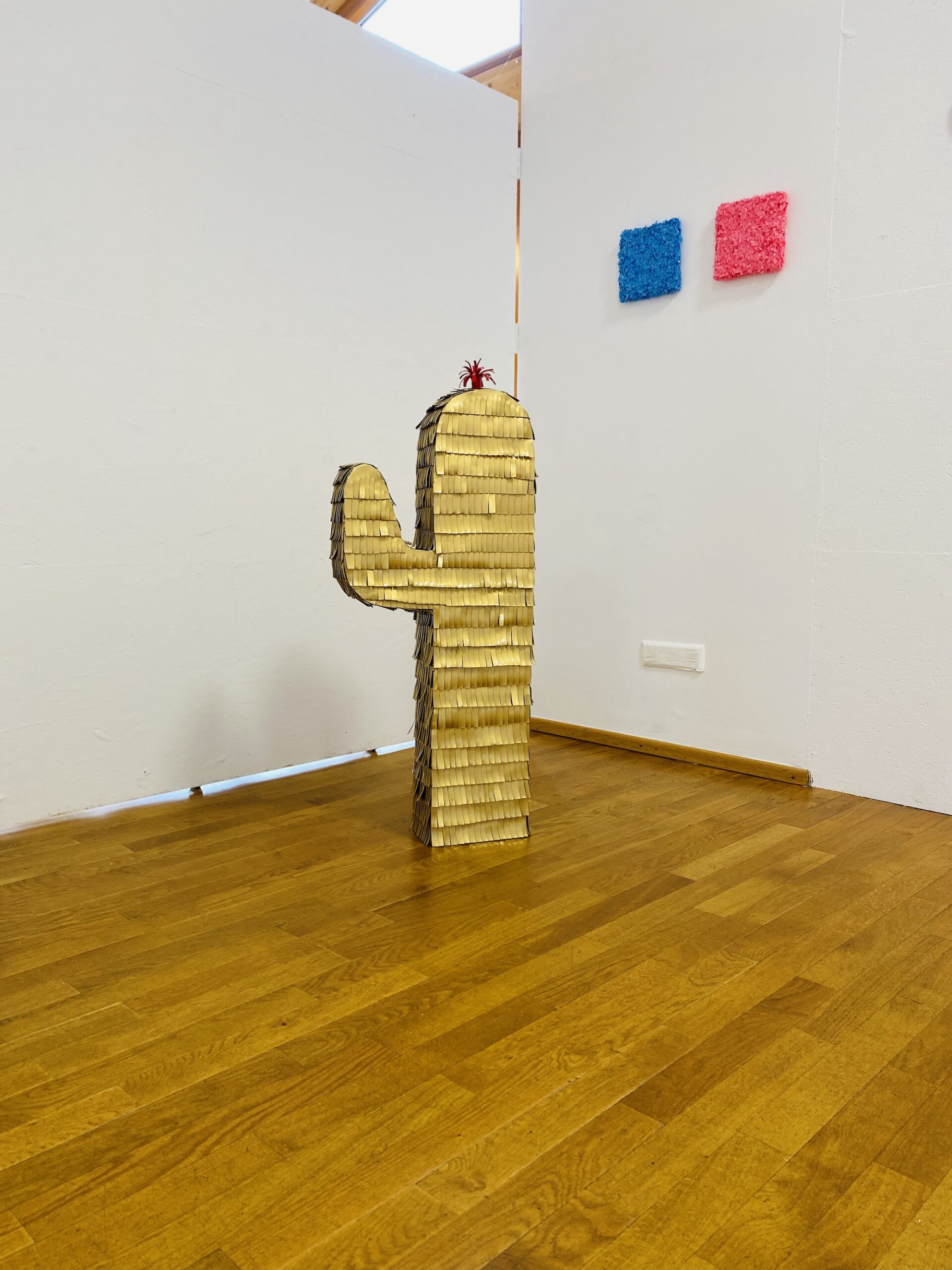 Piñata-Skulpturen, zerplatze Luftballons, Konfetti – Überbleibsel feierlicher Augenblicke – all das verarbeitet Huber in seinen Werken. Er fügt die Materialien, die für ihren ursprünglichen Zweck ausgedient haben, zu abstrakten Bild-Objekten zusammen, deren Reiz vor allem in ihrer anziehenden Farbigkeit und dem glänzenden Überzug liegt. Als „Colourful Moments“ werden sie zu individuell erlebbar. Der Anlass, für den die Materialien einst dienten, rückt in den Hintergrund, wichtig sind allein der symbolische Wert und die jeweils eigenen Erinnerungen, die bei den Betrachtenden ausgelöst werdenWas zunächst vor allem provokativ poppig erscheint, zeugt bei näherer Betrachtung von einer tiefergreifenden Auseinandersetzung mit Themen wie Vergänglichkeit, Luxus, Habitus und Hedonismus, aber auch Materialität.Florian Huber fängt die füchtige Momente des Feierns ein und konserviert diese in seinen Werken.Die Textzeile „Never kiss a cactus, it’s one of Momma’s tips“ des englischen „Cactus Song“ erhält in der Kombination von spitzen, stählernen Piñata-Skulpturen und den luftleeren Ballons einen ungewohnt ernsten Beiklang. Schein und Sein werden hier kritisch hinterfragt, wie in den Skulpturen selbst. Aus Stahl gefertigt, werden die Piñatas ihrem ursprünglichen Nutzen beraubt und so zum bloßen Symbol der Kapitalisierung traditioneller Praktiken, was besonders deutlich wird in der Gegenüberstellung von knallig lackierten und beinahe roh wirkenden Skulpturen.Florian Hubers Werke ziehen mit ihren knalligen Farben, glänzenden Oberflächen und populären Motiven die Blicke auf sich. Was als Einzelobjekt vor allem dekorativ wirkt, entfaltet in der Serie tiefere Bedeutung und zeugt von einer Auseinandersetzung mit wichtigen Themen unserer Zeit. Küss keinen Kaktus, lass Dich nicht von seiner goldenen Oberfläche täuschen, denn das könnte wehtun.